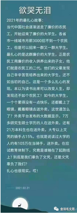 上了大学,读了研究生,又去重复父辈那种不需要高学历的工作。是不是很可悲?攀比是人的本性,如果清理了攀比的条件和环境,那些苦喀喀的家长们,是不是日子能好过一些。最近还看到一个视频,说是中国大城市人口出生率下降,一个很重要的原因,就是生了孩子养不起。养不起孩子的原因有五六条,其中一条就是“课外班”负担太重,虽然国家实行了9年义务教育,可是作为家长,一点没有减低经济负担的感觉,反而比以前负担更重了。如果取消课外培训机构,就可以消除这方面的“内卷”,就没有家长担心自己孩子落后而不惜血本也要去培训的心理负担和经济负担了。白岩松,希望你下次能把这个消除“内卷”的问题写成议案,提交上去。那你就不是白当政协委员了。20210313